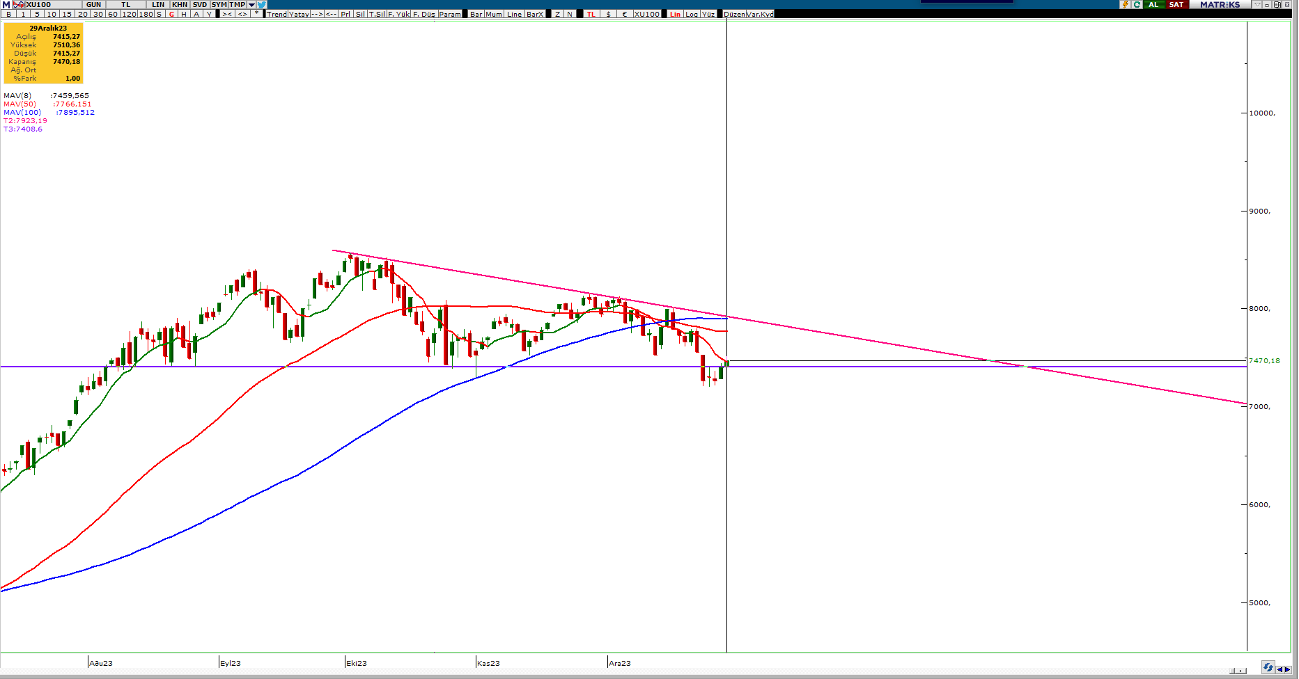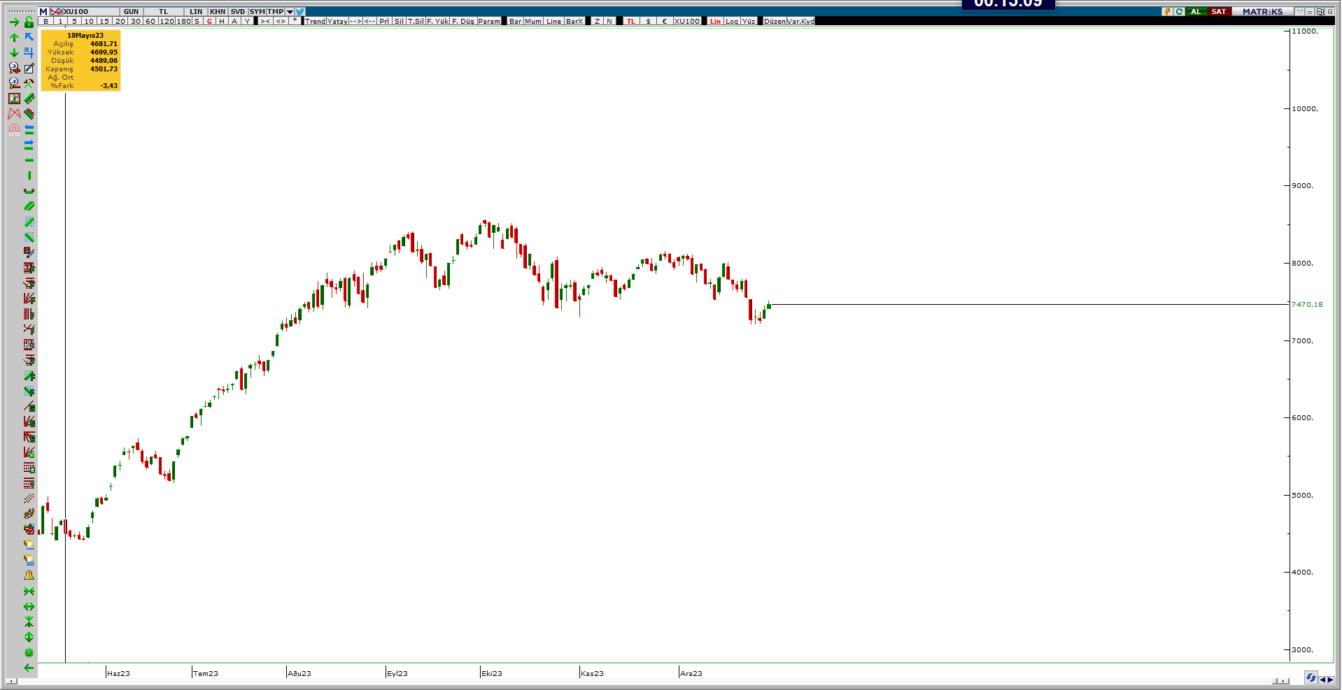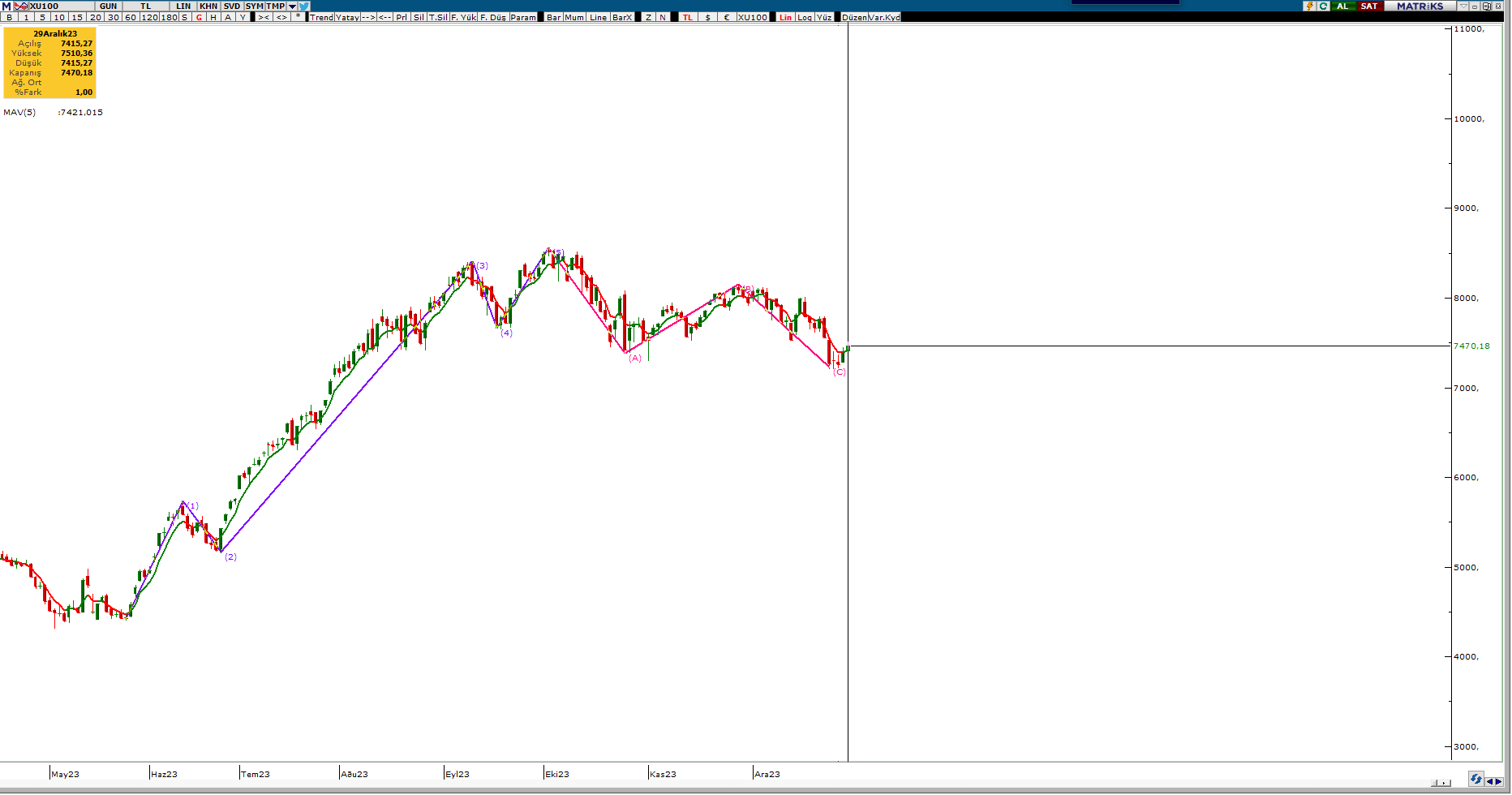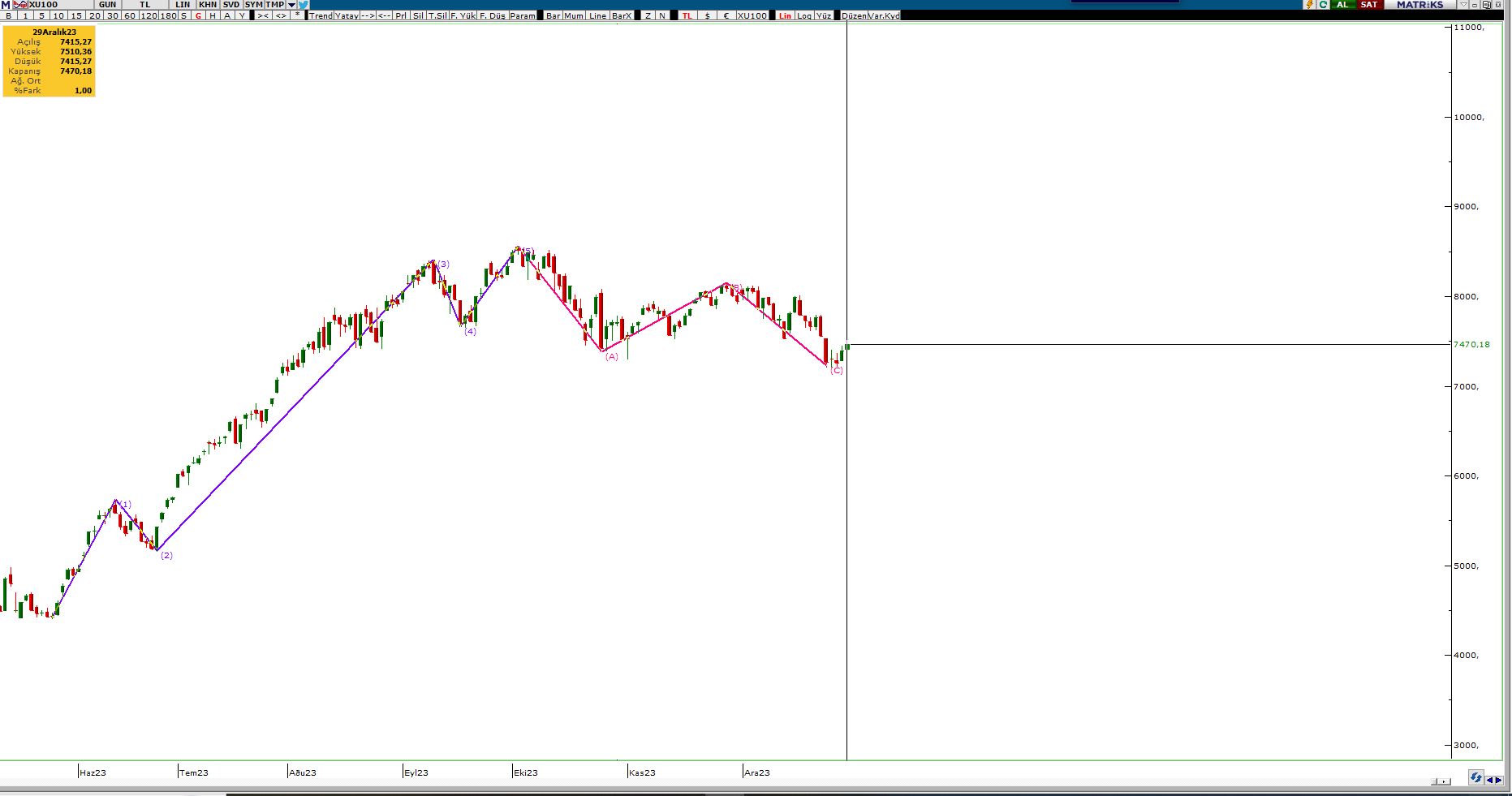 Herkese yeniden selamlar. Seçimden önce mayıs ayında bir analiz yapmıştık. O son endeks analizinden sonra yılı kapatmadan son endeks analizini yapmak istedim. Aslında aradan geçen onca zamanda neler neler oldu. Para politikalarında keskin bir dönüş yaptık. Politika faizleri 8,5 seviyesinden 42,5 seviyesine yükseldi. Endeks ise son yaptığımız analizden bu güne ikiye katlandı. Hatta nur topu gibi bir endeksimiz daha oldu; XU500. Neyse lafı çok uzatmadan gelin hep beraber endeksin son durumuna bakalım.
