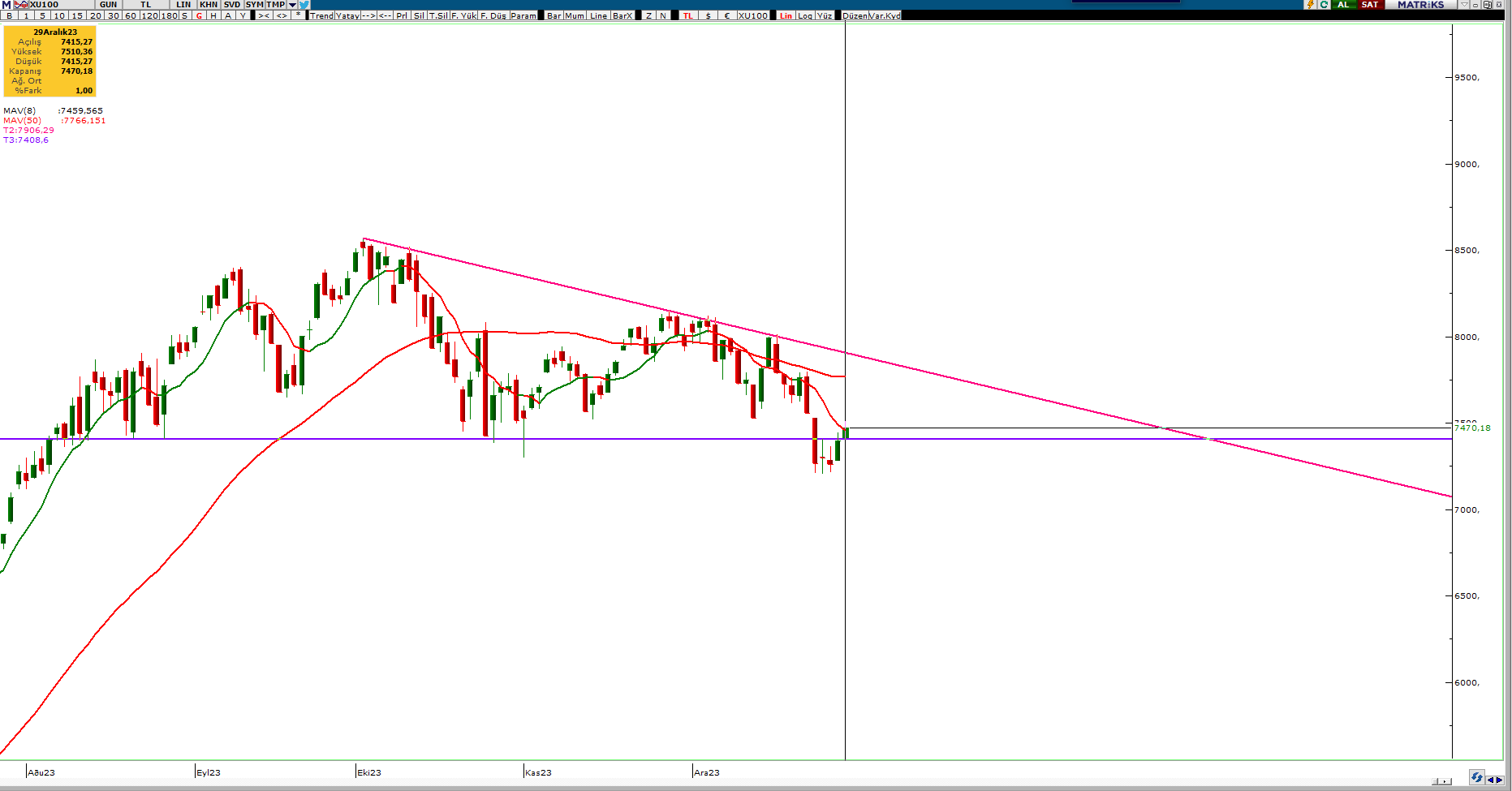 Şimdi ise trend çizgileri ile yolumuza devam edelim. Ayrıca grafik sıklığı olmaması adına da bu görsele her zaman kullandığım 8 günlük ve 50 günlük basit hareketli ortalamaları ekleyeceğim.